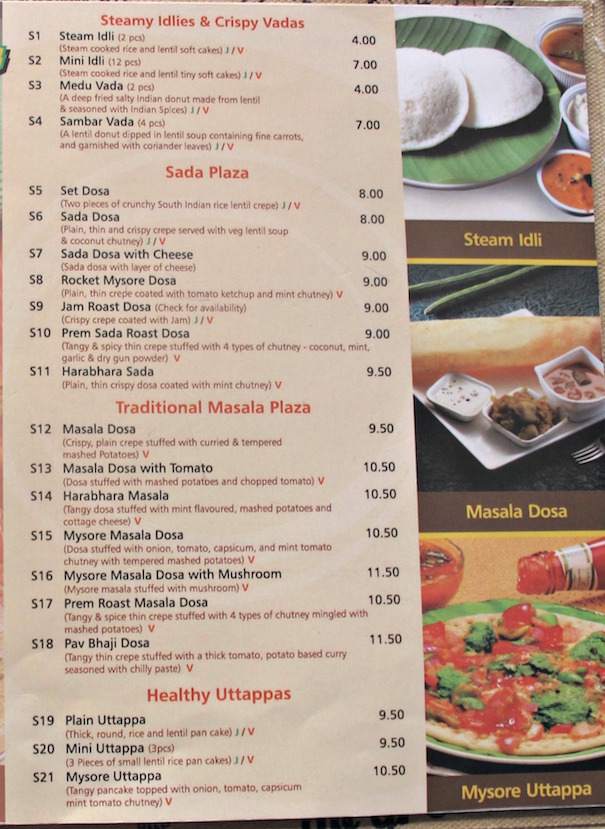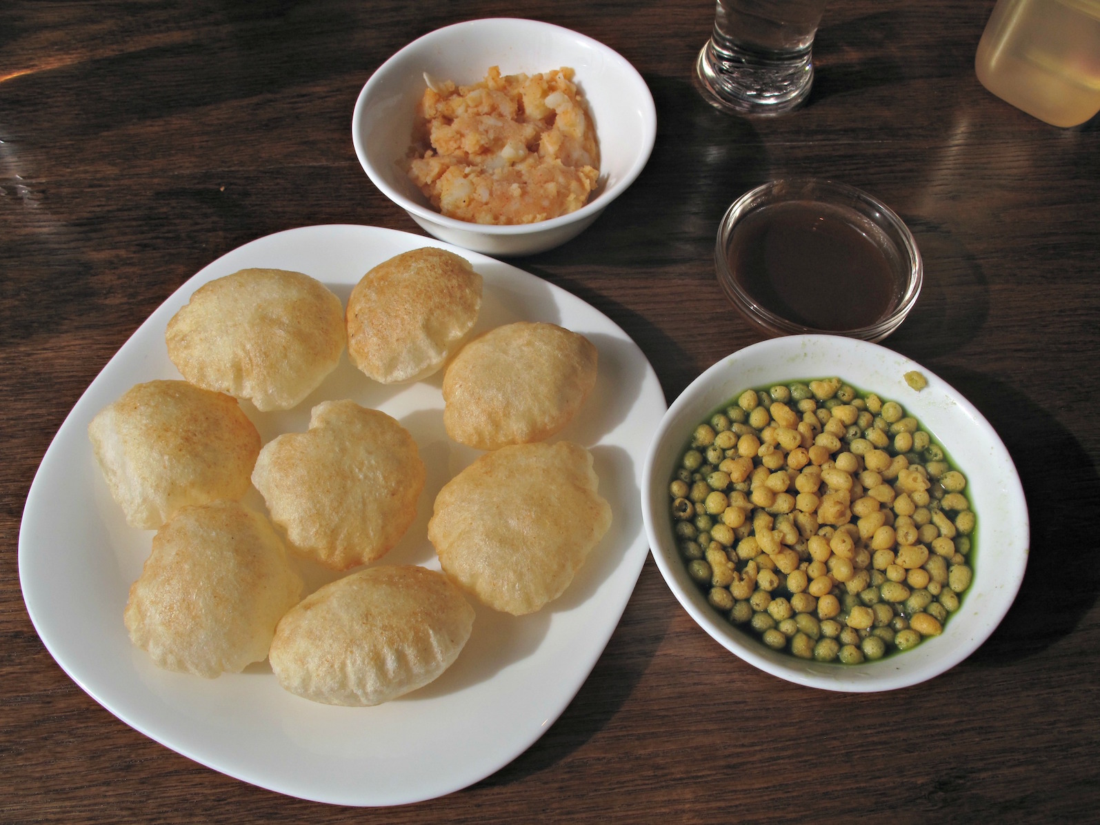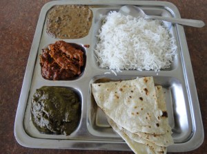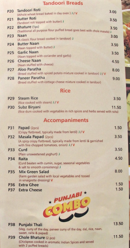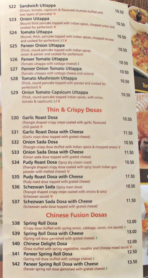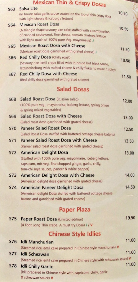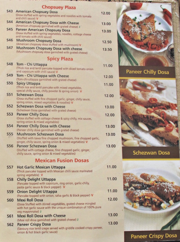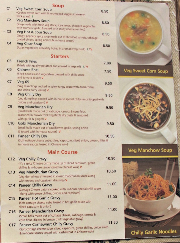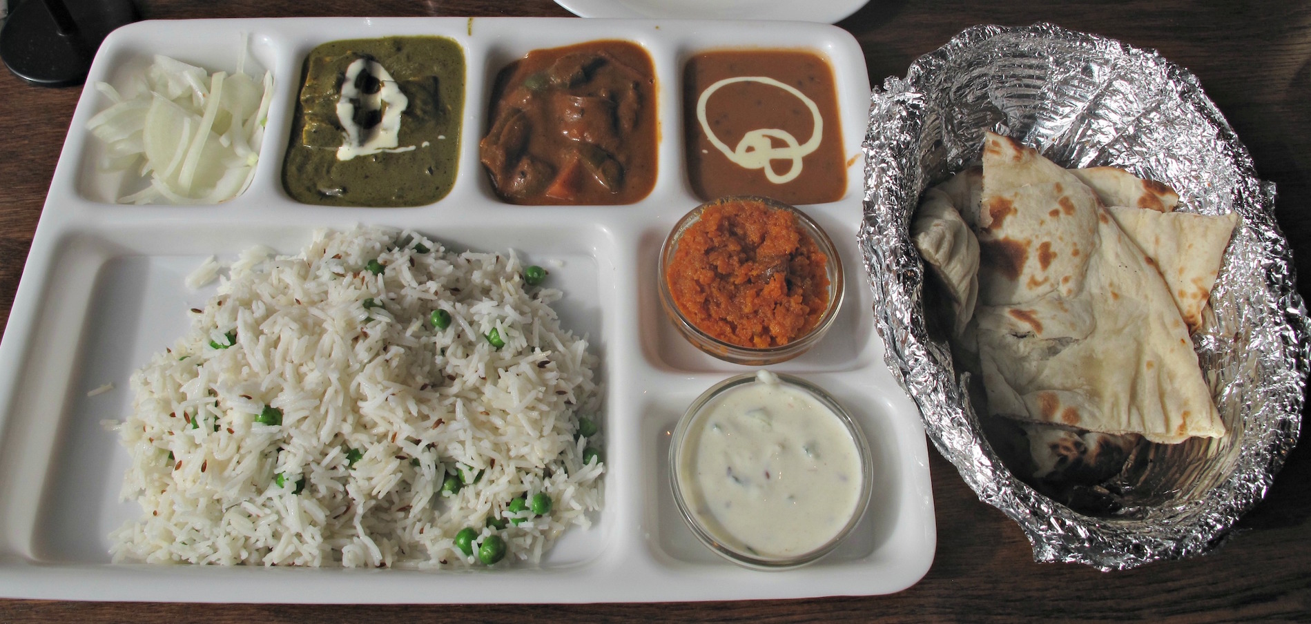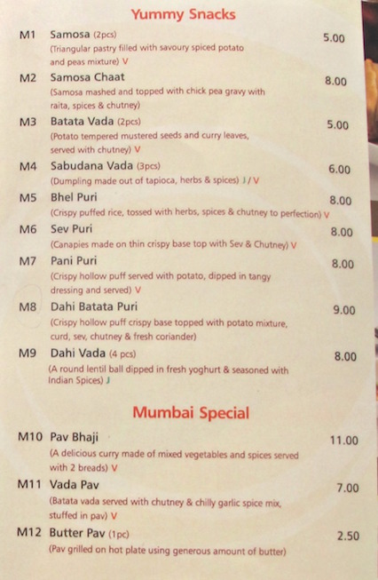 I resist the temptations offered by a sign in the window advertising chole bhature for $7, going instead for onion bhaji (spelt bhujia here) and a vego thali.