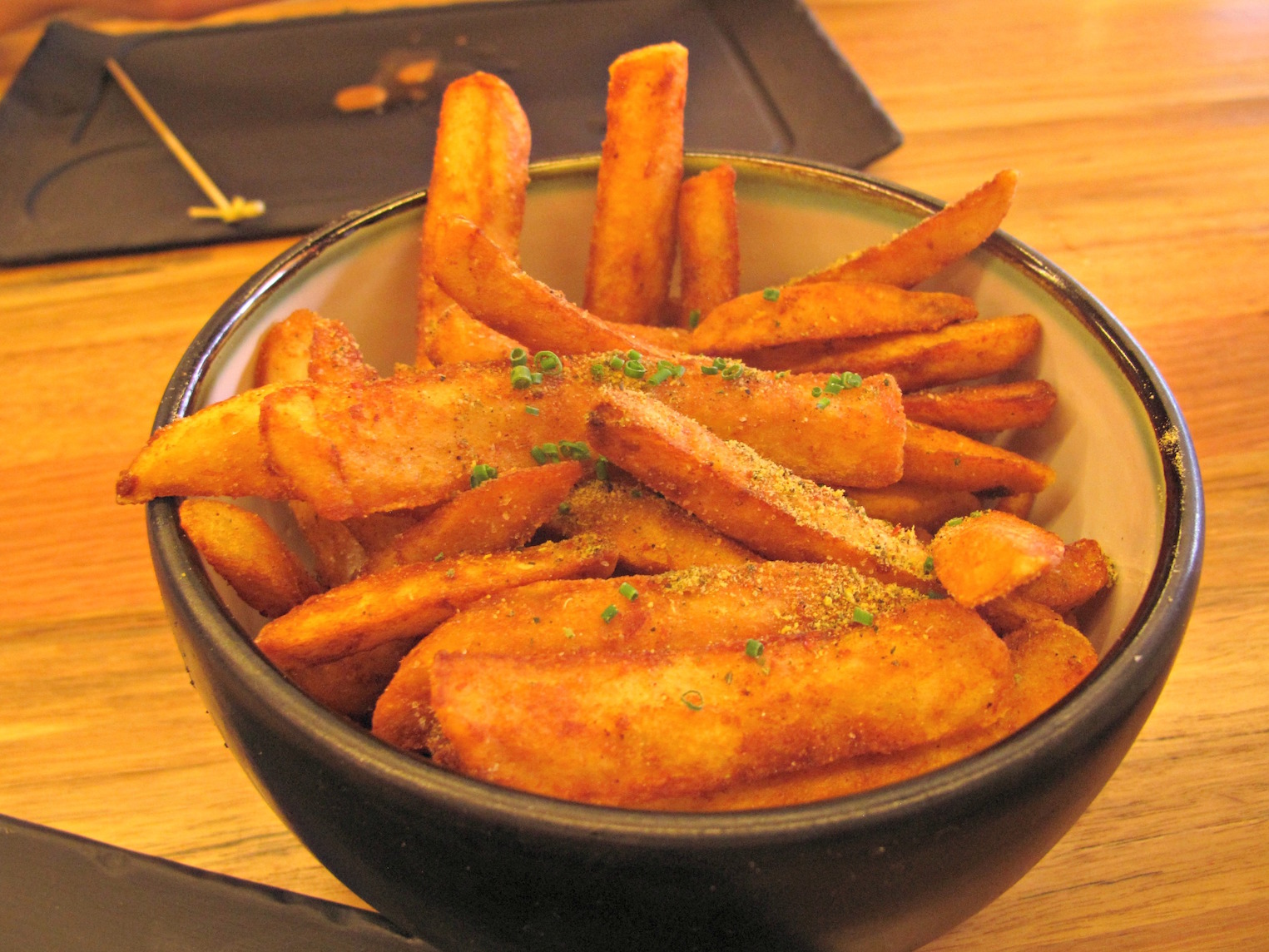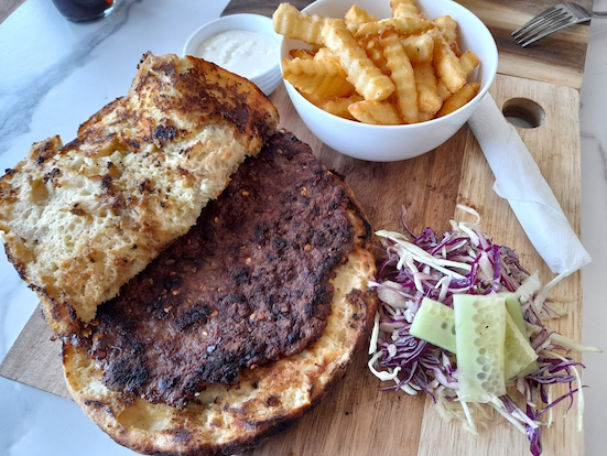The chargrilled bread remains moist and all delicious, the nicely-spicy patty is great and all the bits and pieces – including excellent and very hot crinkle-cut chips – are fine.