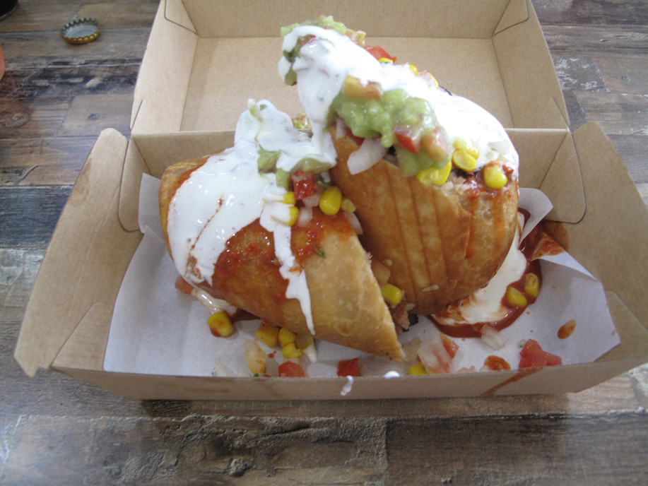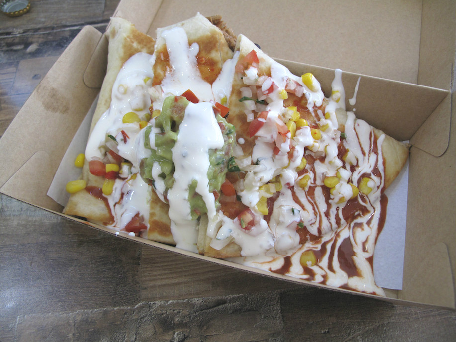 The flour tortilla is toasted after being stuffed with pulled pork, cheese and beans, the whole lot then anointed with sour cream, guacamole, corn and tomato.