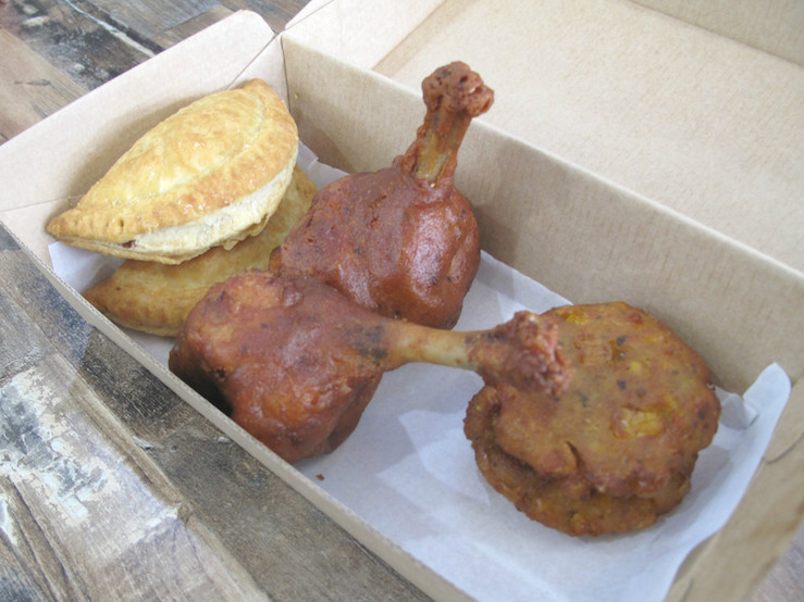 We start with a range of the lads’ snacky items – flaky pastry beef empanada ($1.50 each), devilled chook leg ($1.80) and corn fritters ($2.50 for three).