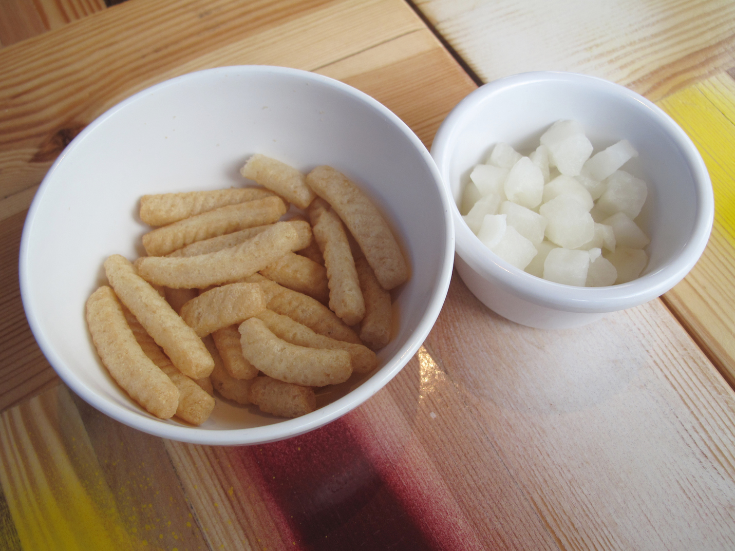 Sweetish pickled radish and … does anyone know what these stubby Korean versions grissini are called?