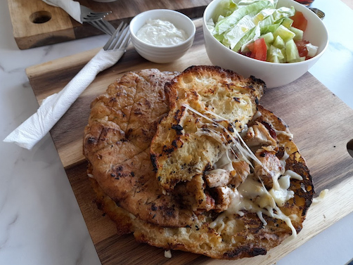 Bennie enjoys his by-request chipless Bosnian Souvlaki ($15.95), which is served with a nice side salad and tazatziki.