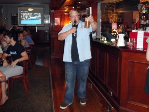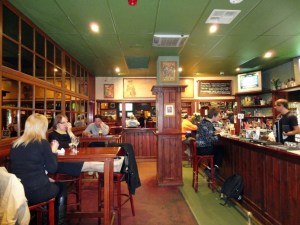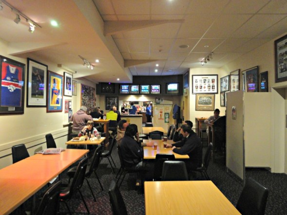 The main bar area being jumping and well on its way to being jammed, we adjourn to the back bar, which is festooned with yet more sports memorabilia and is gradually accepting the bar overflow of patrons.
