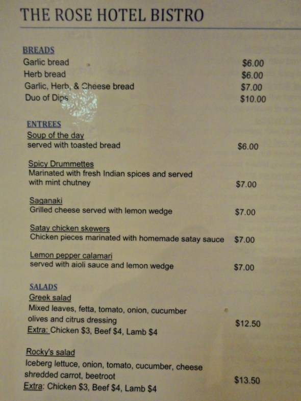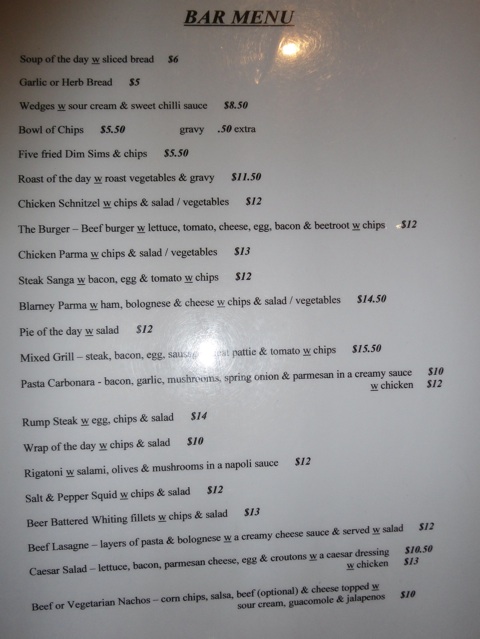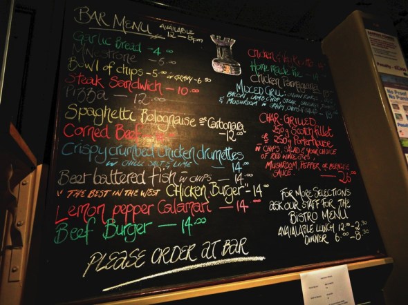 We give the more formal and expensive dining room menu – you can see it at the Mona Castle website – a miss and head straight for the blackboard bar menu.