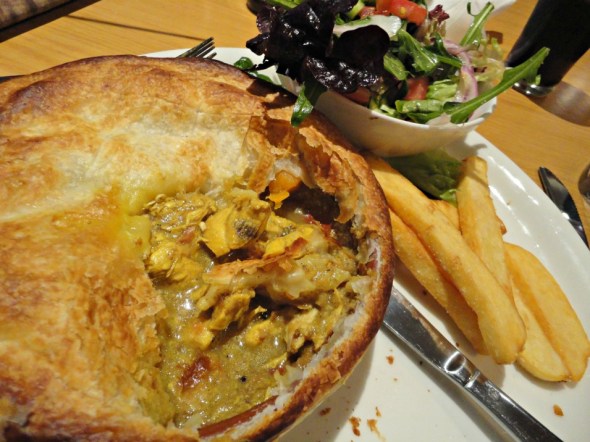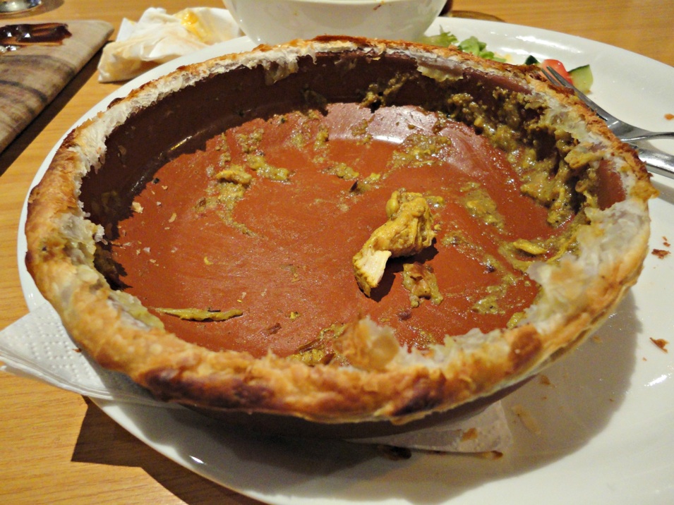 The pie, in a ceramic dish, is lava-like hot and contains heaps of chicken pieces along with chunks of potato and carrot. The seasoning, of course, is regulation curry powder, but frankly anything more funky or sophisticated would be grossly inappropriate.