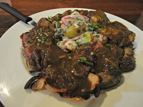 Oh, gee, what a surprise – Bennie orders the hamburger ($14).