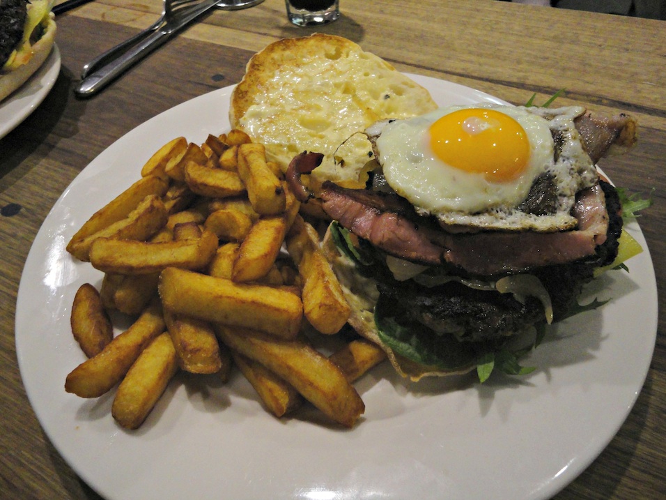 Bennie’s burger is a mountain teetering on the very edge of the wooden board on which it arrives.