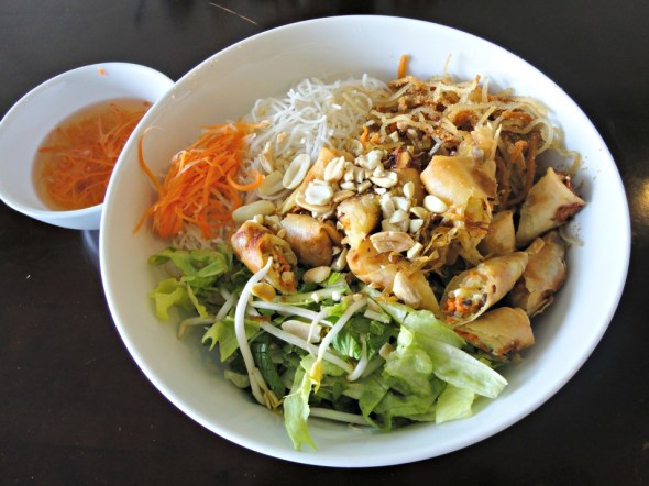 There’s lettuce, grated carrot, mint, peanuts and bean sprouts, of course, along with the vermicelli, and the accompanying chilli sauce adds a good seasoning kick.