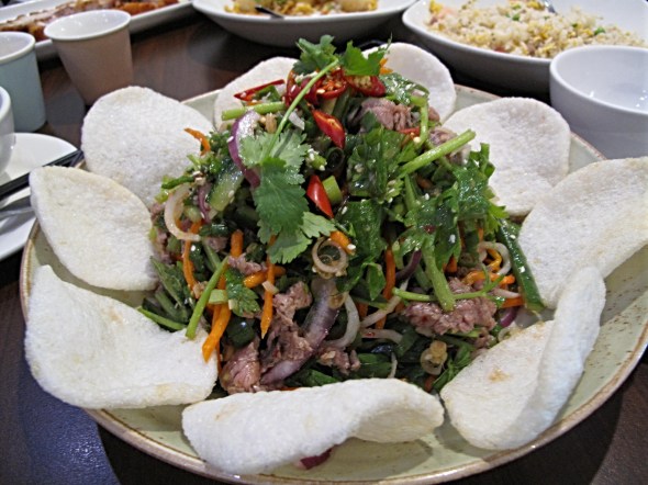 Virginia originally wanted Vietnamese coleslaw, but is delighted nevertheless with the rare beef salad with lemon juice ($25, top photo).