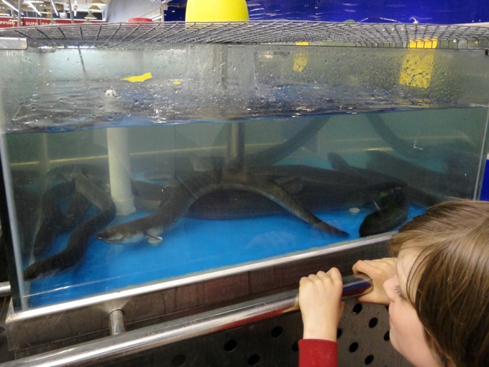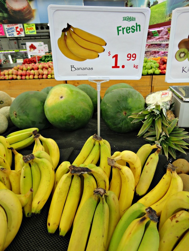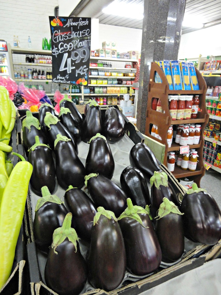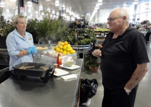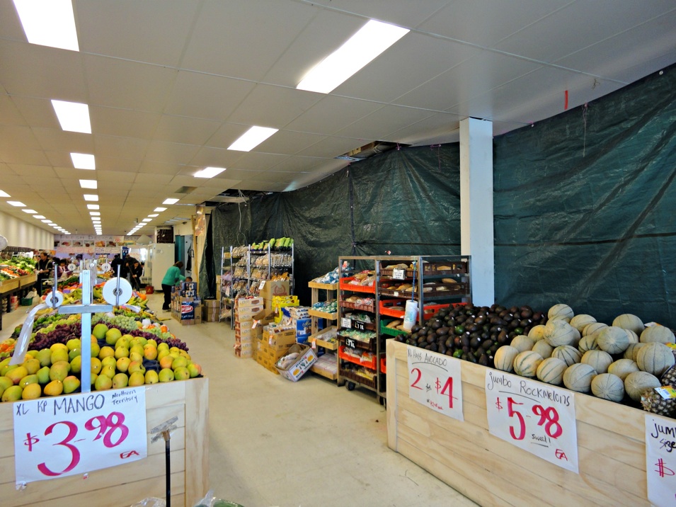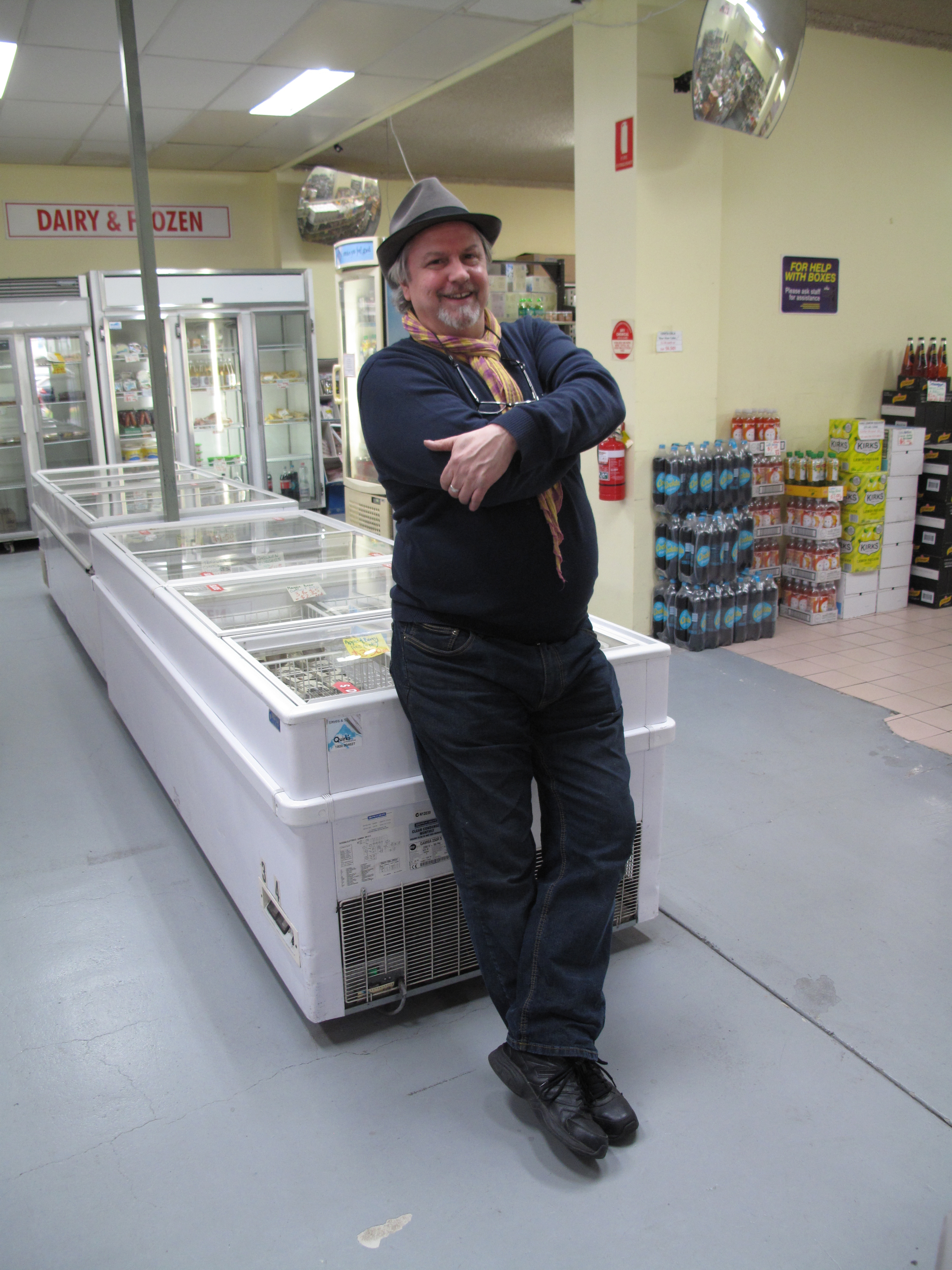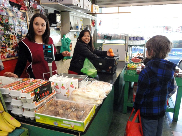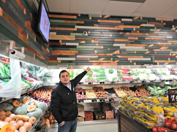 Anthony points out the wooden pannelling above the fruit and vegetable section. It took him and his father-in-law three weeks to install using wood from old fruit boxes of the type just visible bottom right.