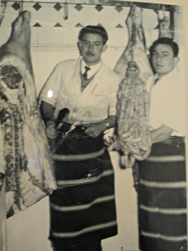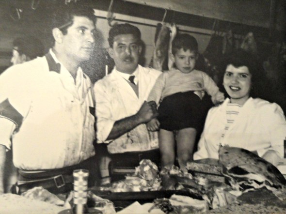 Anthony’s grandfather and grandmother flank his then-toddler father in their North Melbourne butcher shop.