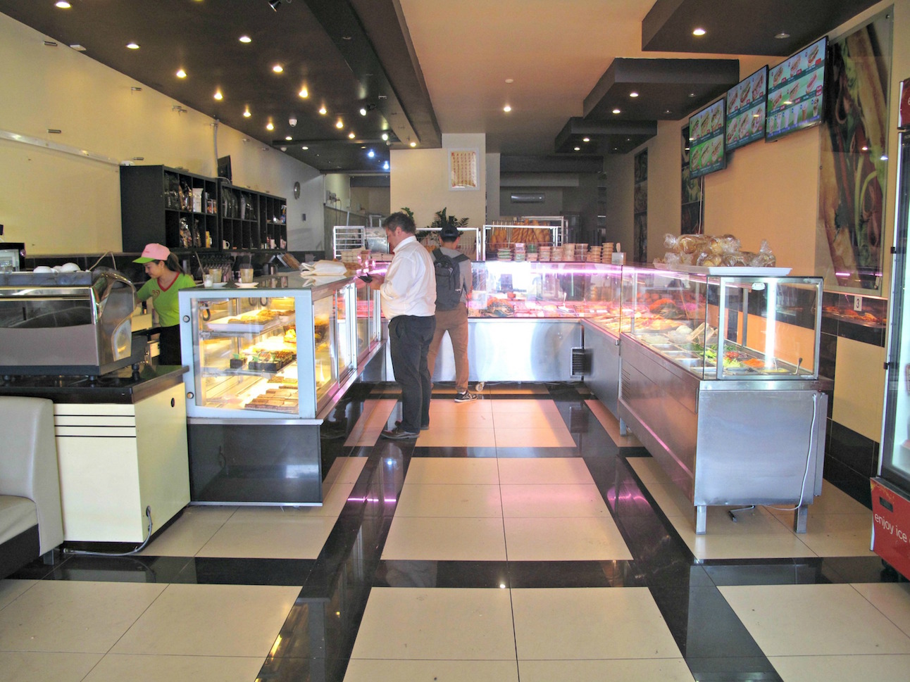 Past the serving/staff area, the kitchen takes up much of what is left of the premise’s space, so the rest of the customer seating is effectively in a long corridor with many tables for four.