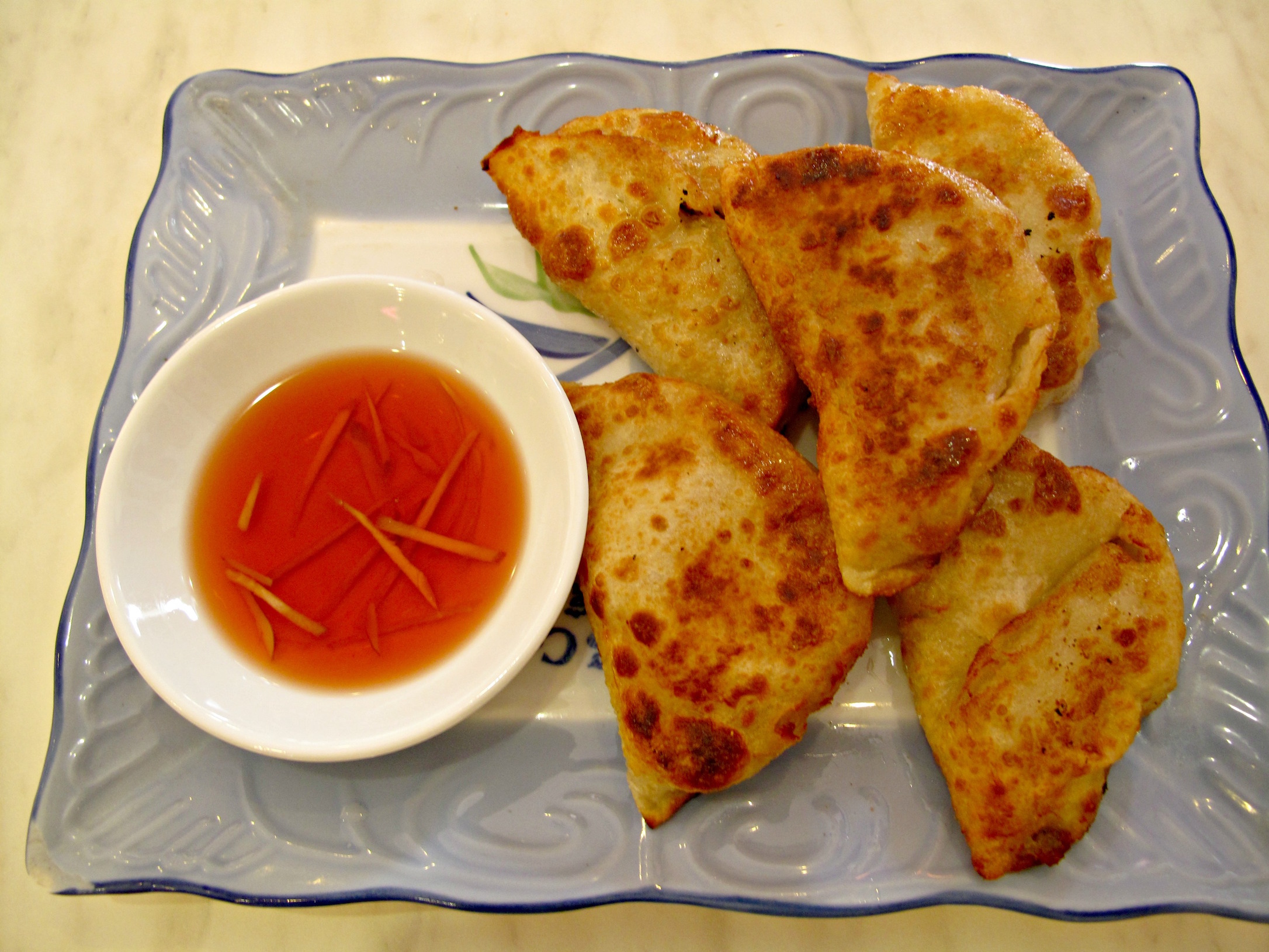 The apple sauce is cold and the pork skin is chewy rather than crisp.