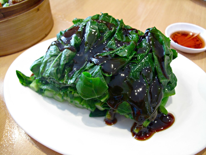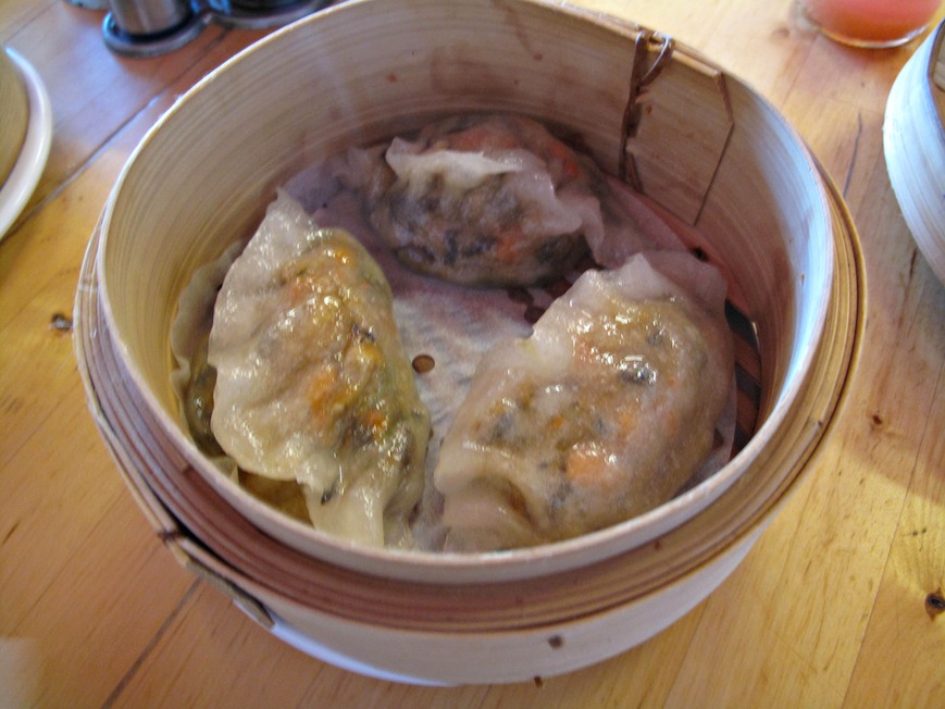 The soft rice covering surrounds fried dough of some sort and also spinach or some similar leafy vegetable. It all disappears, though, and is tasty dipped in the accompanying bowl of oyster sauce.